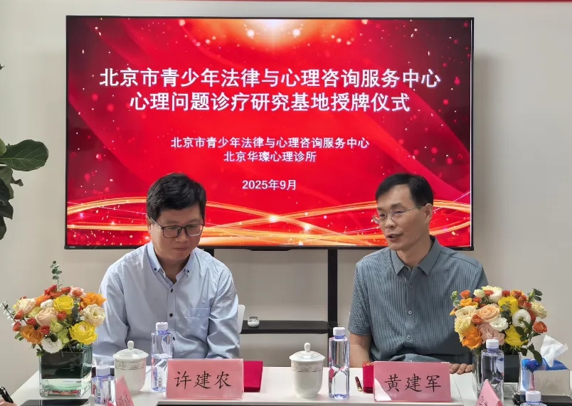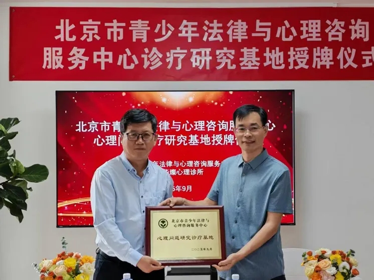 2025年9月17日上午,北京市青少年法律与心理咨询服务中心与北京华璨心理诊所携手,隆重举行了“心理问题诊疗研究基地”授牌仪式,北京华璨心理诊所青少年心理问题诊疗研究基地正式成立。